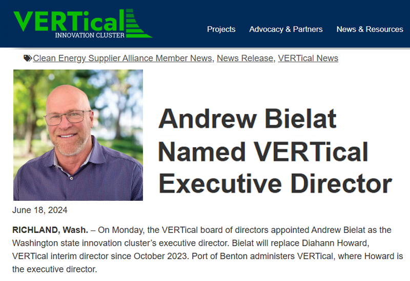 RICHLAND, Wash. – On Monday, the VERTical board of directors appointed Andrew Bielat as the Washington state innovation cluster’s executive director.
